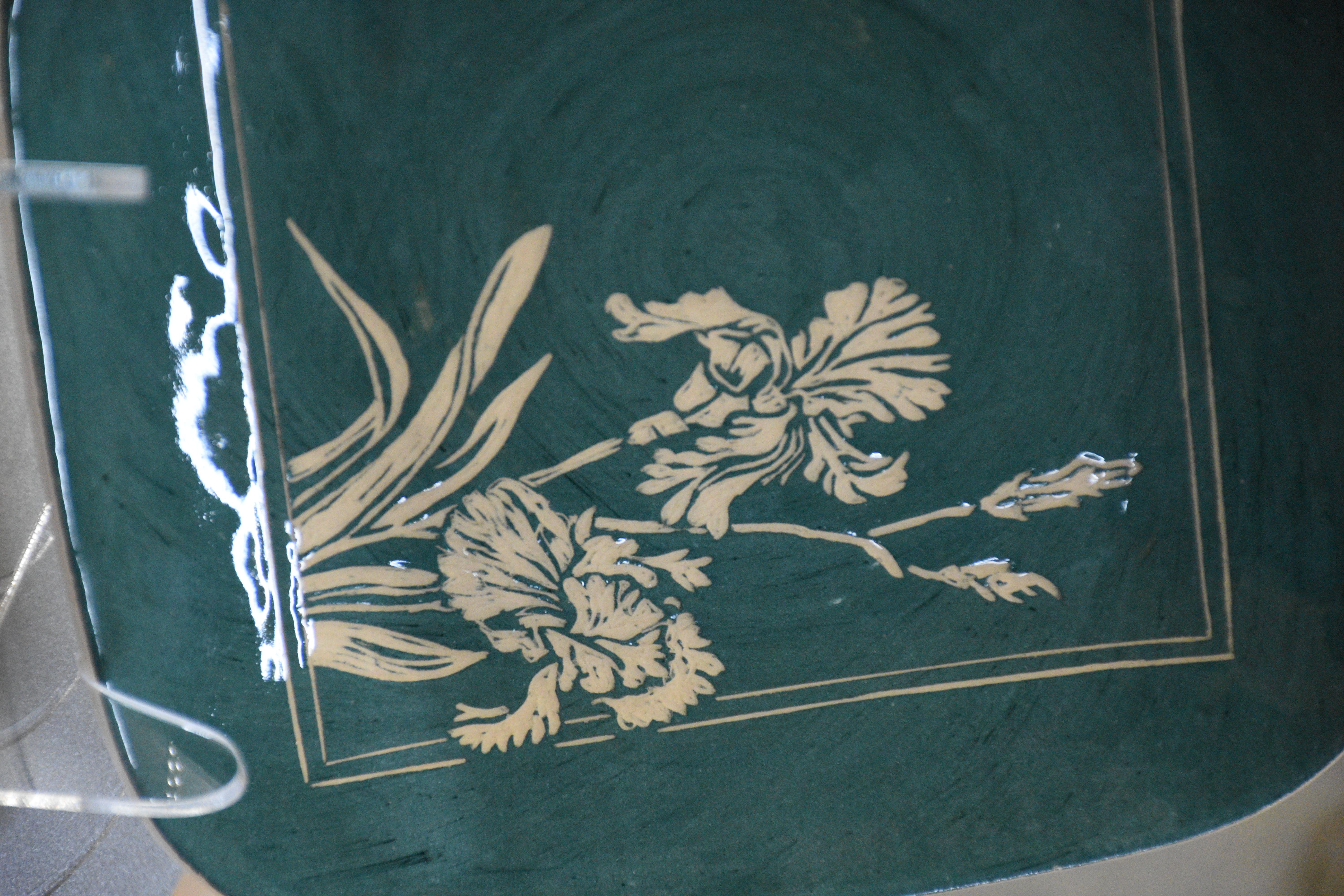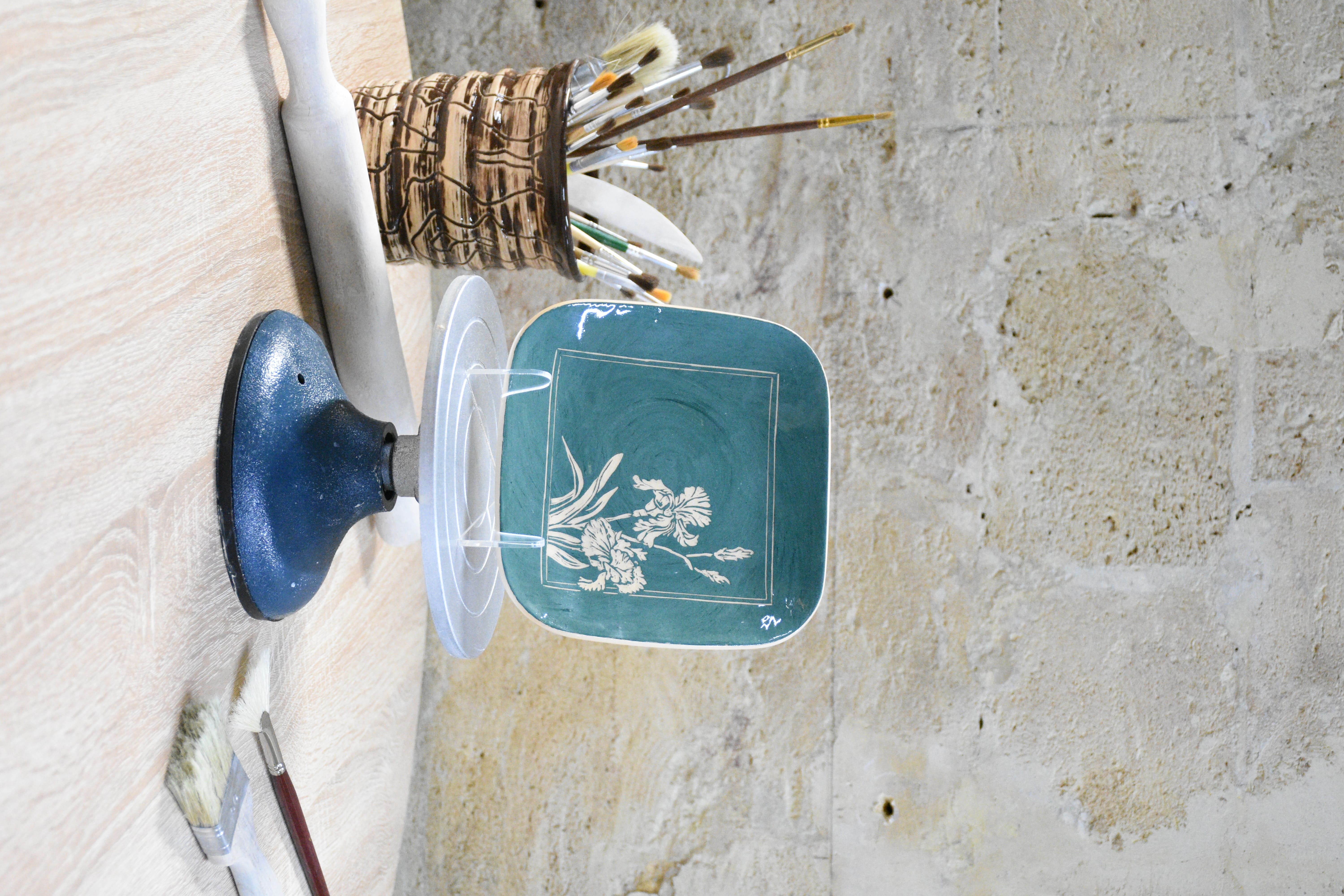 This handmade square plate features a deep emerald hue reminiscent of twilight in a garden. Delicate irises are “drawn” using the sgraffito technique—each line is carved by hand, revealing the light-colored clay beneath the engobe layer.